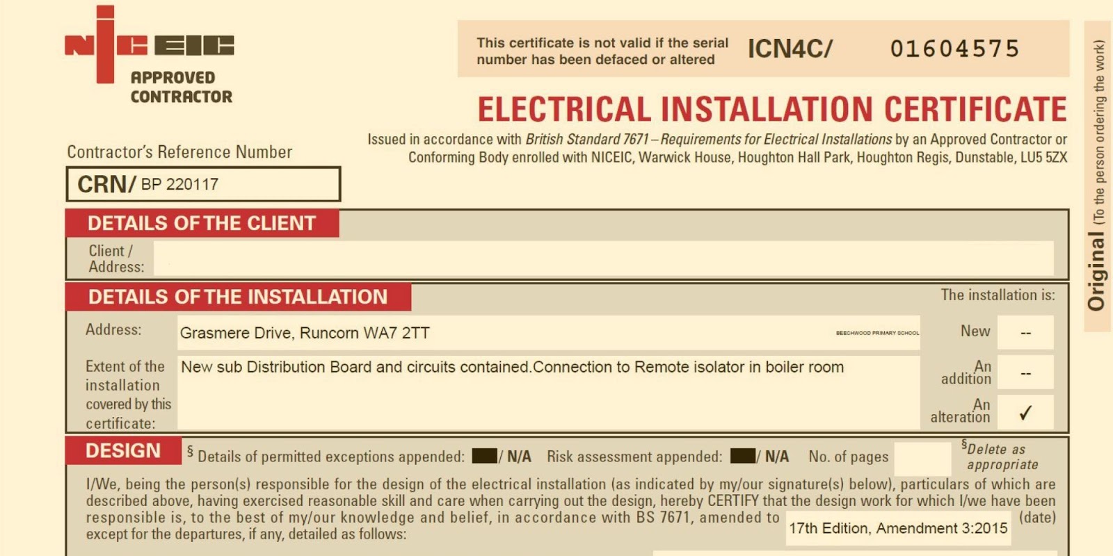 Niceic domestic electrical installation condition report.